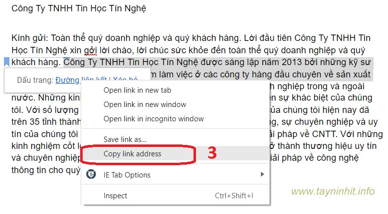 Click chuột phải vào phần Liên kết > Copy link address để lưu liên kết bookmark vào clipboard.