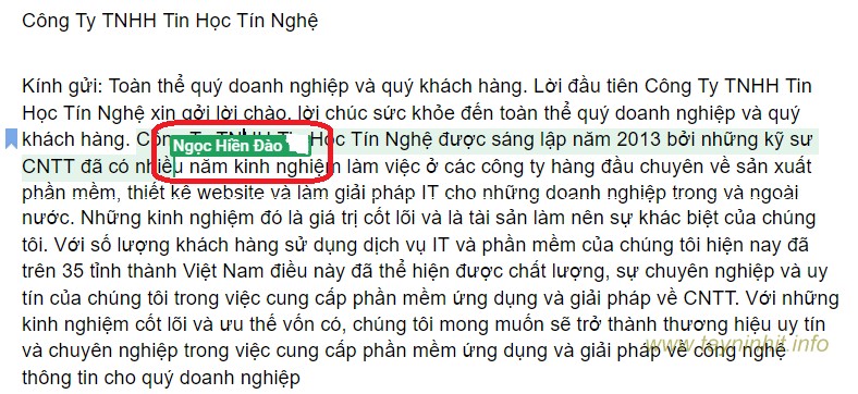 Khi người nhận truy cập link bookmark, tài liệu sẽ tự động di chuyển tới vị trí văn bản đã được đánh dấu, kèm tên tài khoản Google Docs đã tạo bookmark đó.