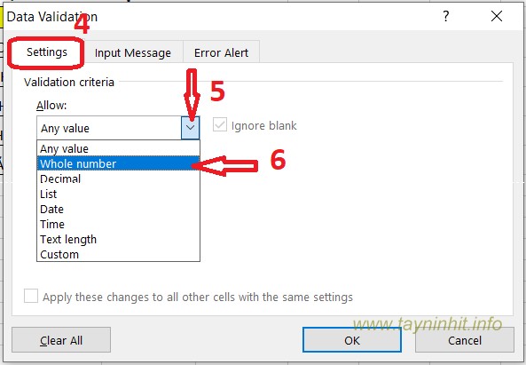 - Bước 3: Lúc này cửa sổ Data Validation xuất hiện, tại tab Settings bạn hãy cấu hình như sau: