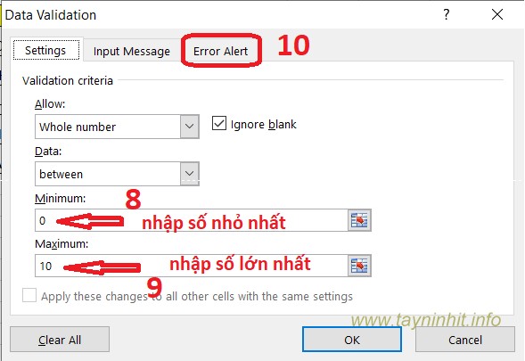 - Ở 2 ô Minimum và Maximum: Tức là phạm vi giá trị (bạn nhập theo yêu cầu, giả sử điểm số thì từ 0 đến 10 thì bạn nhập Minimum là số 0, và Maximum là 10), khi bạn nhập giá trị nhỏ hơn 0 và lớn hơn 10 sẽ báo lỗi!