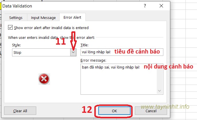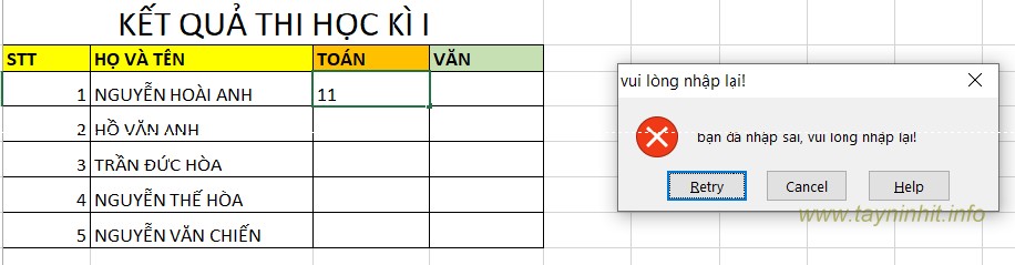 Sau khi thực hiện xong bạn có thể thực hiện việc nhập liệu (giả sử hình bên dưới là bảng điểm của học sinh khi tôi nhập vào ô điểm là số 11 thì nó sẽ xuất hiện một hộp thoại cảnh báo) và chúng ta sẽ nhập lại cho đúng nhé!