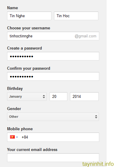 - Choose your username: Điền tên tài khoản Gmail mà bạn muốn tạo. (Nhập tên tài khoản chưa có ai dùng mới được chấp nhận)- Create a password: Nhập mật khẩu cho tài khoản- Confirm your password: Xác nhận lại mật khẩu vừa nhập ở trên (yêu cầu mật khẩu này phải trùng khớp với mật khẩu ở mục Create a password)- Birthday: Nhập ngày, tháng, năm sinh- Gender: Giới tính
