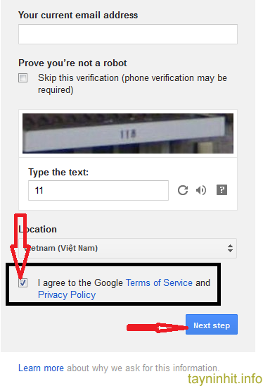 - Prove that you're not a robot: Bạn phải điền thật chuẩn những kí tự trong hình mà Gmail cung cấp, điền trong mục Type the text, để chứng minh rằng bạn là người đăng kí chứ không phải là robot đăng kí.Nếu những mấu kí tự trên quá khó hiểu, bạn có thể thay đổi mẫu kí tự khác bằng cách click vào biểu tượng mũi tên xoay vòng.- Location: Quốc gia bạn đang sinh sống.- Đánh dấu chọn trong mục I agree... để đồng ý với các điều khoản dịch vụ và các chính sách bảo mật của Google.Click Next Step để tiếp tục.