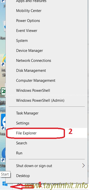 - Bước 1: Click chuột phải vào nút Start, sau đó click vào File Explorer.