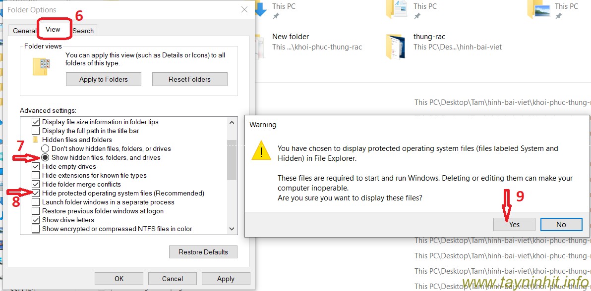 - Bước 5: Ngoài ra, bạn tìm Hide protected operating system files và bỏ tích nó. Bạn sẽ nhận được cảnh báo không được xóa bất cứ thứ gì quan trọng, nhưng đừng lo chúng ta không xóa bất cứ thứ gì => Yes