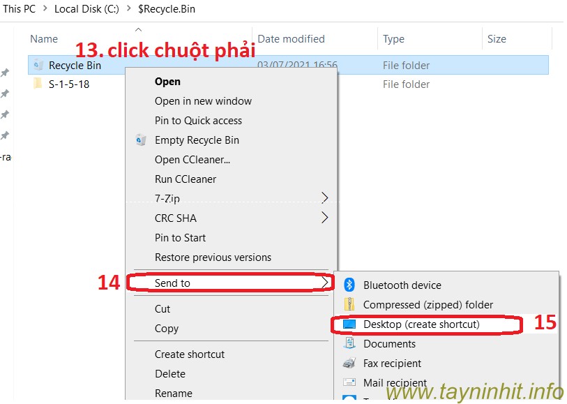 - Bước 7:. Click chuột phải vào Recycle Bin, di chuột qua Send To và click vào Desktop (create shortcut).