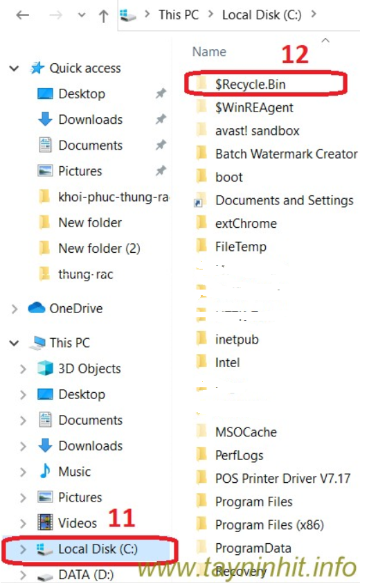 - Bước 6: Quay trở lại File Explorer và click vào This PC trên thanh bên trái, sau đó truy cập ổ C:, bạn sẽ tìm thấy ngay ở trên đầu có file gọi là $Recycle.Bin, truy cập vào thư mục đó và bạn sẽ thấy Recycle Bin ở đây.