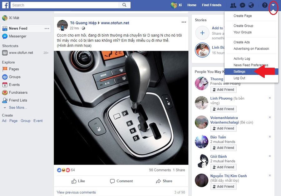 Để tắt thông báo Facebook ở góc màn hình máy tính theo dạng chạy ngầm, chúng ta chỉ cần vào Settings (trong danh mục mũi tên nhỏ trên góc phải).