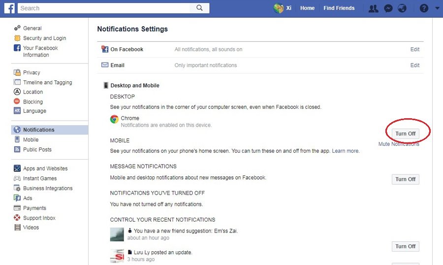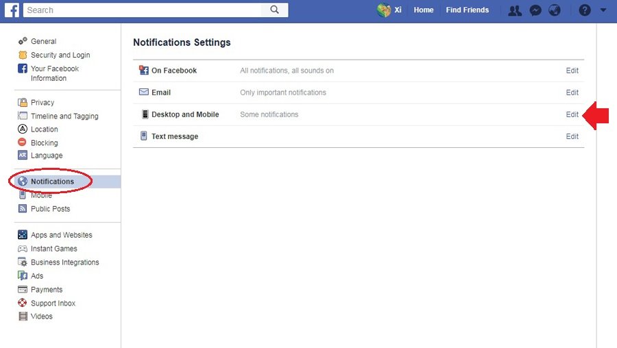 Để tắt thông báo Facebook ở góc màn hình máy tính theo dạng chạy ngầm, chúng ta chỉ cần vào Settings => Notifications rồi bấm Edit đối với mục Desktop and Mobile. Sau đó chúng ta bấm Turn Off với trình duyệt đang kích hoạt thông báo chạy ngầm.
