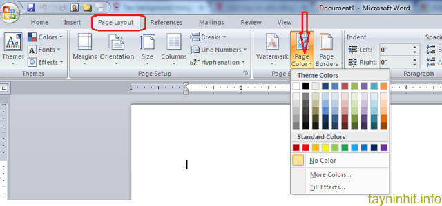 - Bước 1: Mở trang văn bản lên, sau đó vào tab Page Layout --> Page Color , hộp thoại màu Backgroud sẽ xuất hiện như hình dưới.