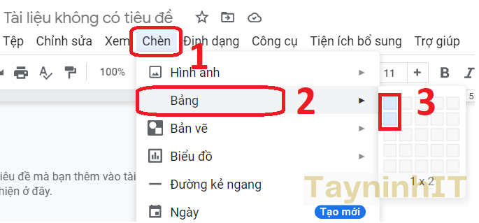 - Bước 1: Để bắt đầu, hãy đặt con trỏ vào vị trí nơi bạn muốn chèn hình ảnh và chú thích. Nhấp vào Chèn "Insert " > Bảng "Table" và chọn bảng “1 x 2”. Lập tức trên tài liệu sẽ xuất hiện một bảng chứa một cột và hai hàng (ô).