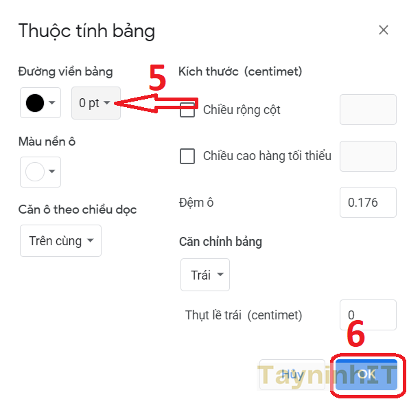 - Bước 4: Ở ô đường viền bảng chọn “0 pt” > “OK”.