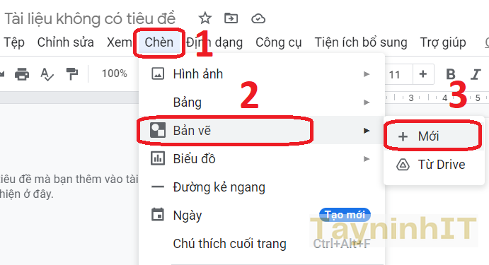 - Bước 1: Đặt con trỏ vào vị trí trong tài liệu, nơi mà bạn muốn chèn hình ảnh và chú thích. Sau đó, nhấp vào Chèn ( Insert ) > Bản vẽ ( Drawing) > Mới ( New )
