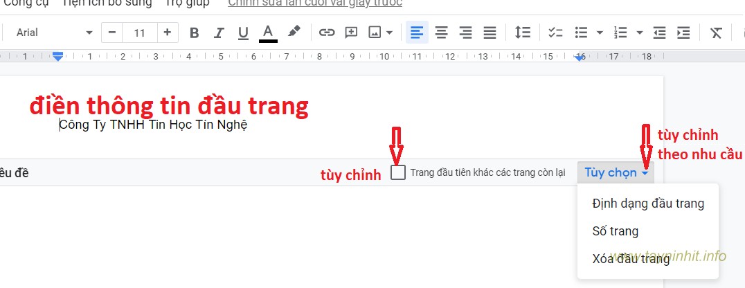 Trong phần tùy chỉnh đầu trang (Header) hay cuối trang (Footer) thì Google Docs ta có thể tùy chỉnh sau