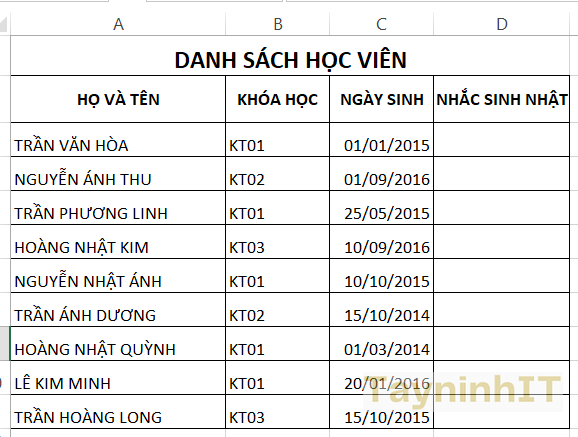 - Bước 1: Chúng ta chuẩn bị bảng dữ liệu Excel. Phần ngày sinh bạn để định dạng ngày