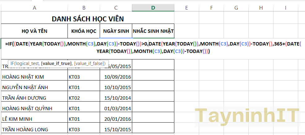 Chúng ta sẽ tiến hành kết hợp các hàm trong Excel, bao gồm hàm IF trong Excel để trả về giá trị thỏa mãn điều kiện, hàm DATE để trả về giá trị ngày, hàm TODAY để dùng ngày hiện tại, hàm YEAR để lấy năm, hàm MONTH dùng để lấy tháng và hàm DAY dùng để lấy ngày.