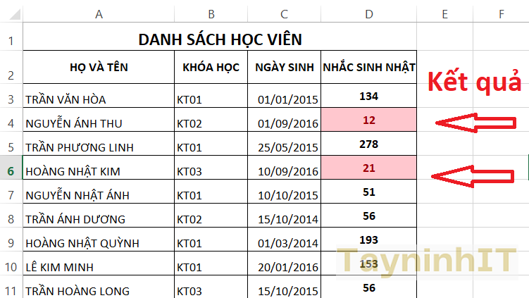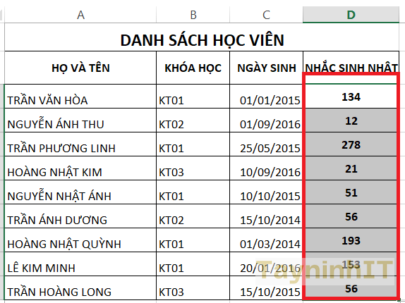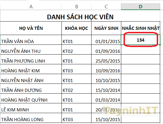 - Bước 2: Tại ô nhắc ngày sinh nhật, chúng ta sẽ tiến hành nhập công thức để tính số ngày sinh nhật sắp tới của từng người.
