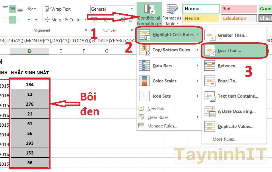 Bạn bôi đen cột nhắc ngày sinh nhật rồi nhấn lên công cụ Conditional Formatting > Highlight Cells Rules > Less Than.