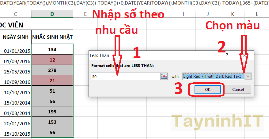 - Bước 5: Xuất hiện bảng LESS THAN > ô Format cells that are bạn nhập 30 để lấy mốc ( tùy theo nhu cầu có thể nhập số khác ) nhắc sinh nhật trong vòng 1 tháng > Phần with chọn kiểu làm nổi bật ô. Nhấn biểu tượng mũi tên để chọn các kiểu gồm: