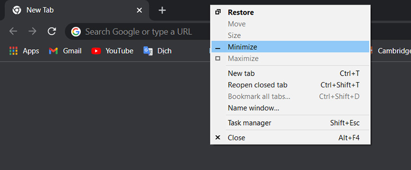 Hoặc bạn có thể chọn cách nhấn phải chuột trên thanh tiêu đề để mở menu của thanh tiêu đề, hay sử dụng tổ hợp phím Alt + Spacebar (phím cách) và sau đó nhấn chọn Minimize để thu nhỏ màn hình làm việc trên máy tính.