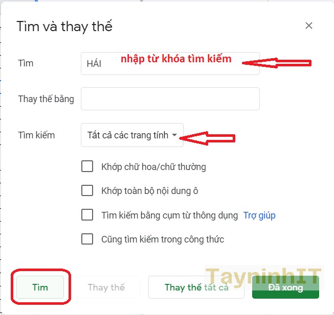 - Bước 2: Trong cửa sổ “Find and Replace”, “Find” (Tìm) > nhập từ khóa tìm kiếm. ở ô Tìm kiếm chọn “All sheets” (Tất cả các trang tính) > “Find” (Tìm) để bắt đầu tìm kiếm.