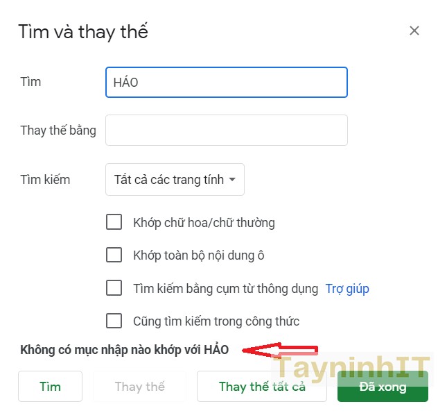 Ngược lại, nếu Google Sheets không tìm thấy kết quả, nó sẽ hiển thị thông báo không tìm kiếm được