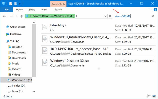 Cuối cùng, để tìm ra tất cả các tệp có dung lượng lớn hơn 1GB nhưng nhỏ hơn 5GB (bạn có thể đặt bất kỳ kích thước nào), chỉ cần nhập size:>500MB<5GB trong trường tìm kiếm.