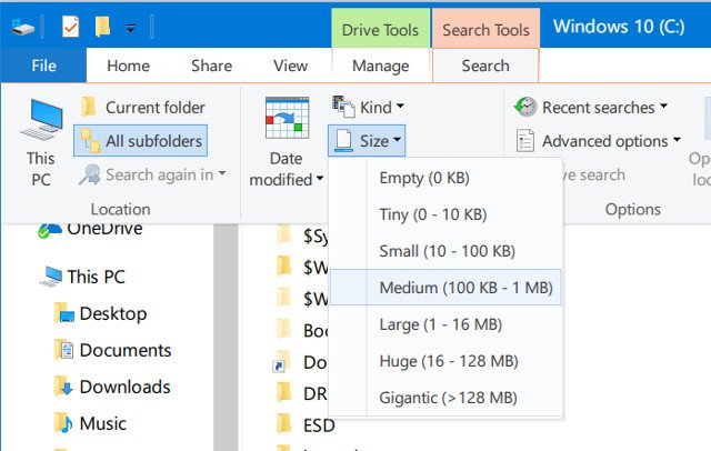 Dưới đây là cách tìm kiếm các tệp có dung lượng lớn bằng cách sử dụng tìm kiếm File Explorer trong Windows 10.