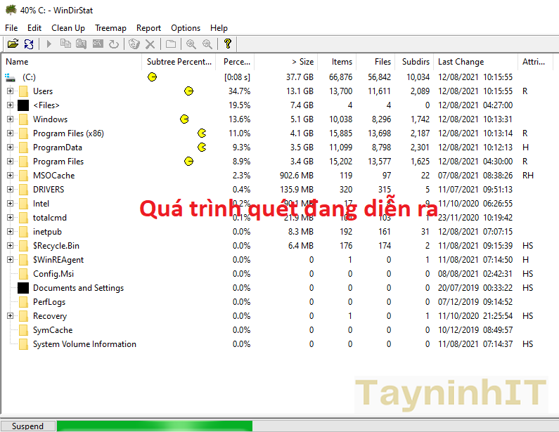 - Bước 4: Ngay sau khi bạn nhấp vào nút OK, WinDirStart sẽ bắt đầu quét. Tùy thuộc vào kích thước ổ và số lượng file, quá trình quét sẽ mất một khoảng thời gian để hoàn thành. Vì vậy, hãy ngồi đợi cho đến khi quá trình quét hoàn tất. (phần mềm này chạy rất nhanh)
