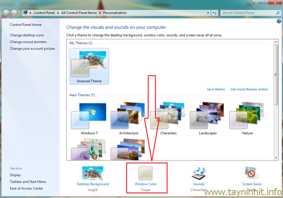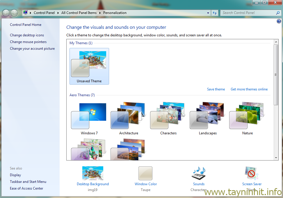 Bạn cũng có thể tạo các theme cho riêng mình. Bắt đầu bằng việc áp dụng background, màu sắc, âm thanh và bộ bảo vệ màn hình của desktop mà bạn muốn cho theme; những lựa chọn của bạn lúc này sẽ xuất hiện trong cửa sổ Personalization như một Theme chưa được lưu.