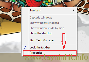 - Bước 1: Click chuột phải vào một điểm nào đó trên taskbar và chọn Properties. (Một cách khác mà bạn có thể thực hiện là mở Control Panel và chọn Taskbar and Start Menu)