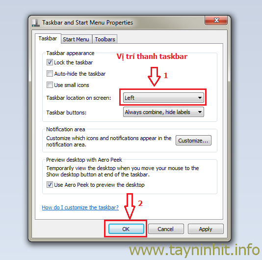 - Bước 2: Khi hộp thoại Properties của Taskbar and Start Menuxuất hiện, chọn tab Taskbar.