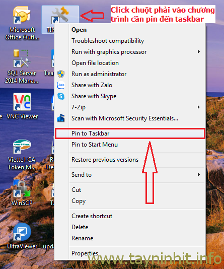 - Bước 2: Click phải vào mục cần chọn và chọn Pin to Taskbar từ menu xuất hiện.