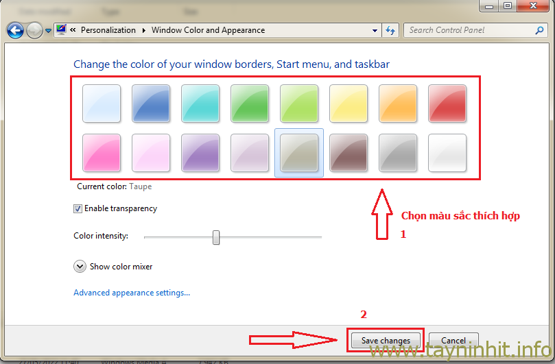 - Bước 3: Cuối cùng, các bạn tiến hành chọn màu sắc cho thanh Taskbar thông qua bảng màu có sẵn.