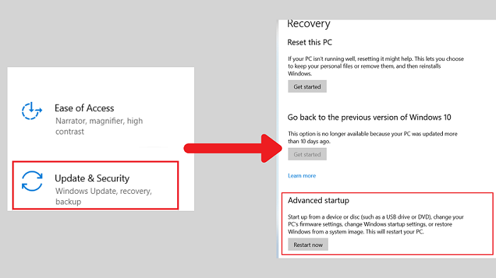 - Bước 3: Chọn các mục Recovery -> Restart now để máy tính khởi động lại, bước vào BIOS.