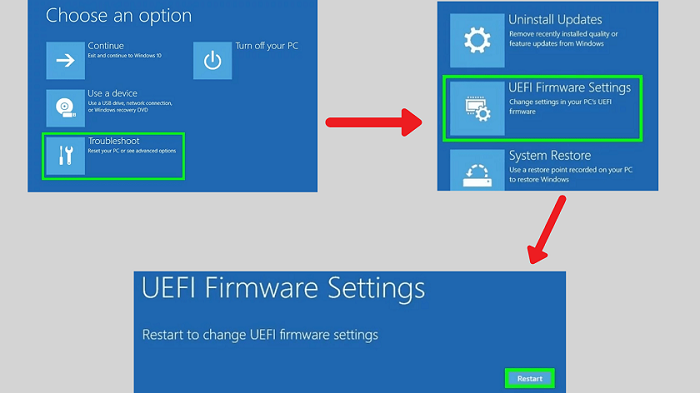 - Bước 5: Bên trong cửa sổ Troubleshoot, chọn Advanced Options -> UEFI Firmware Settings -> Restart.