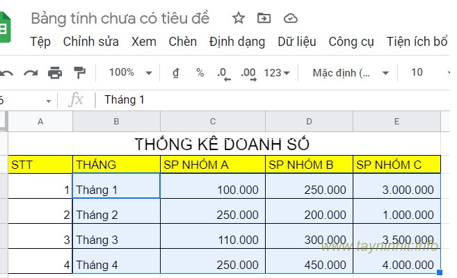 Bạn chuẩn bị 1 bảng dữ liệu trên Google Sheets Excel, nếu chưa biết cách soạn bạn tham khảo bài viết trước tại đây