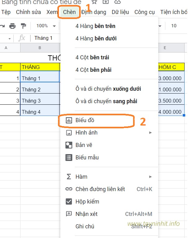 - Bước 2: Chọn Insert (chèn) =>Chart (biểu đồ)