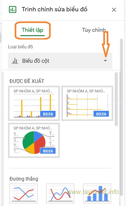 Để thay đổi dạng biểu đồ khác, trên cửa sổ hiển thị ở góc bên phải màn hình, tại tab Thiết Lập , click biểu tượng hình mũi tên hướng xuống dưới nằm kế bên mục Loại biểu đồ và chọn dạng biểu đồ bất kỳ mà bạn muốn sử dụng