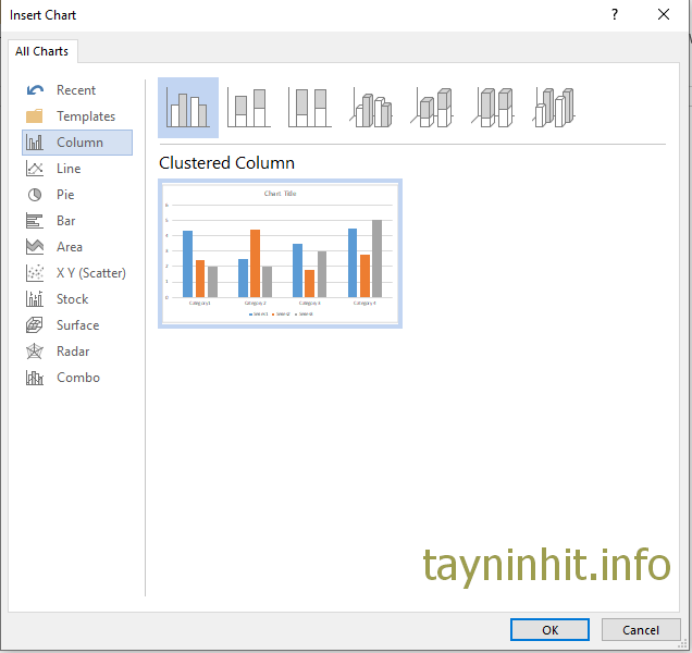 - Bước 3: Sau khi chọn dạng biểu đồ click OK. Như ở đây mình chọn dạng biểu đồ Column và chúng ta sẽ có một bảng như sau: