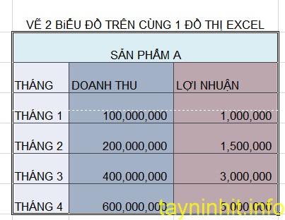 Giả sử bạn có một bảng dữ liệu như hình dưới cần chèn 2 biểu đồ trên cùng 1 đồ thị: