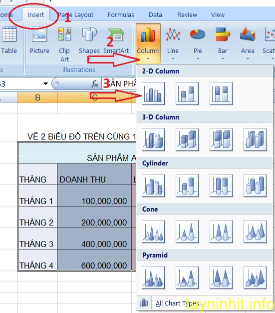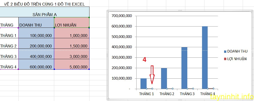 - Bước 4: Để vẽ biểu đồ đường cho cột LỢI NHUẬN bạn thực hiện tiếp như sau:
