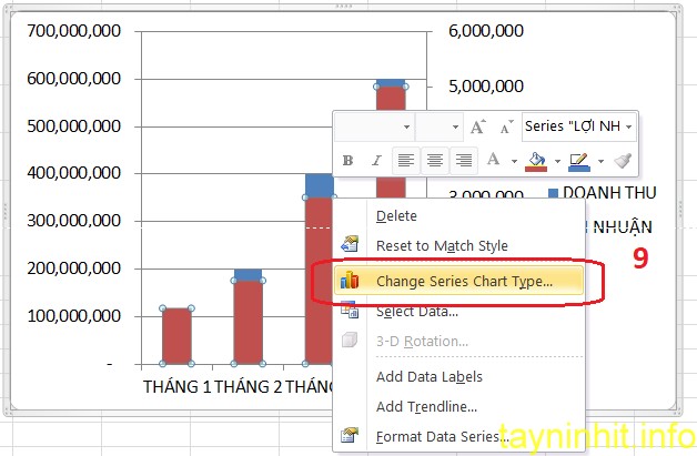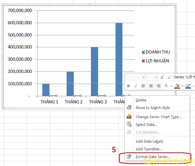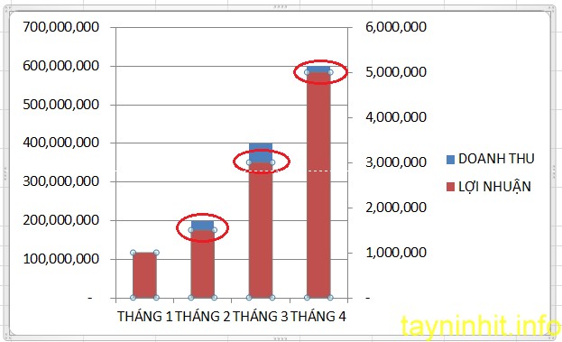 Bạn nhấn chuột trái vào LỢI NHUẬN ( lúc này dấu tròn sẽ hiện trên tất cả các cột màu xanh )