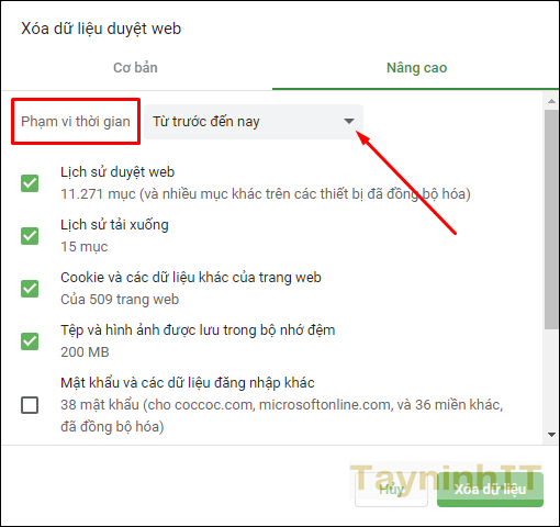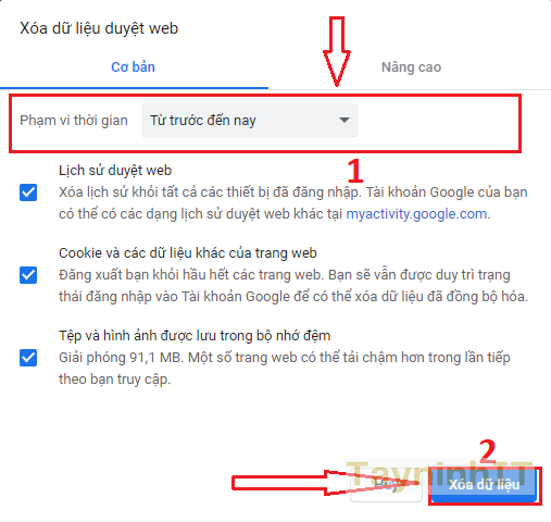 - Bước 2: Bảng Xóa dữ liệu duyệt web hiện ra, chọn Nâng cao