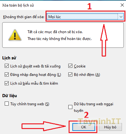 - Bước 3: Hộp thoại "Xóa toàn bộ lịch sử" hiện ra, các bạn chọn "khoảng thời gian để xóa", Nội dung bên dưới, các bạn tích vào các ô lịch sử dữ liệu cần xóa --> nhấn OK để xóa.