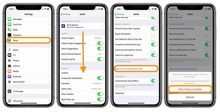 - Bước 1: Bạn vào Settings (Cài đặt), kéo xuống dưới và các bạn sẽ thấy Safari -> Xoá Lịch sử hoặc Xóa cookie và dữ liệu có thể giúp tiết kiệm hàng trăm MB cho iOS.