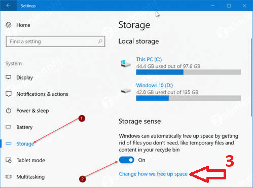 - Bước 2: Trong mục Storage sense trong cửa sổ bên phải => On. Sau đó bạn click tiếp vào tùy chọn Change how we free up space ngay phía dưới.
