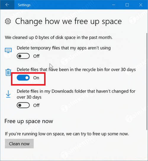 Đối với những phiên bản Windows 10 mới này người dùng có thể lựa chọn xóa file trong thùng rác sau 1 ngày, 14 ngày, 30 ngày và 60 ngày.