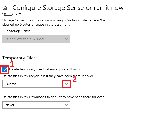 - Bước 3: Lúc này giao diện cửa sổ mới sẽ xuất hiện, ở đây bạn tích vào mục Delete temporary files that my apps aren’t using => sau đó chọn số ngày sẽ xóa file rác trong cửa sổ xổ xuống.
