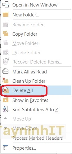 Nếu các bạn cần xóa tất cả thư email trong hộp thư đến Outlook thì tại mục Inbox, nhấn chuột phải > Chọn Delete All.